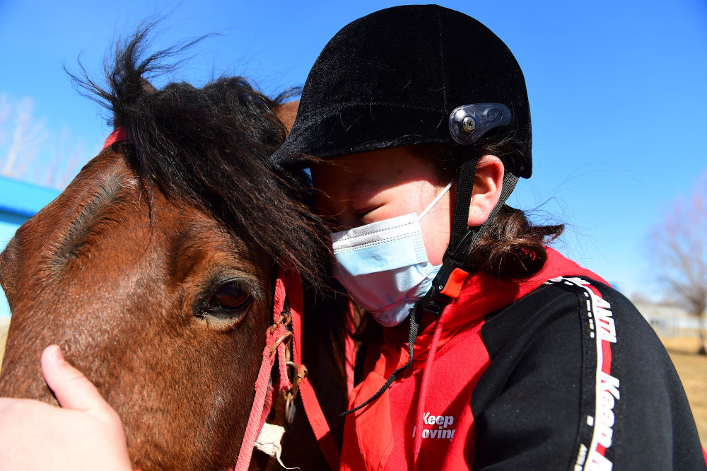 ↑阿勒泰地区布尔津县窝依莫克镇寄宿制中学七年级二班学生阿合叶尔克·朱马在为马匹整理缰绳(2021年3月30日摄)。