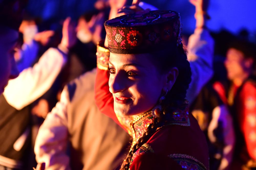 ↑2021年5月3日,一位演员在喀什地区塔什库尔干塔吉克自治县金草滩景区表演。