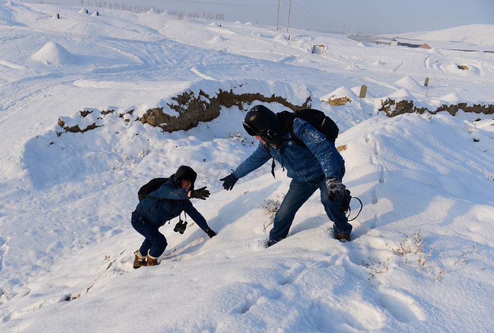 ↑2020年12月30日,国网乌鲁木齐供电公司输电运检中心运维三班巡线员张彦哲(左)、张厅喜在巡线途中。