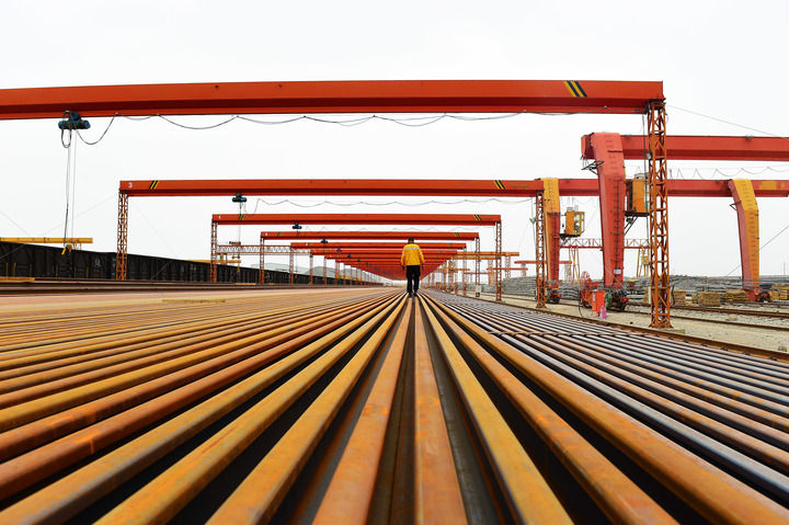 ↑和若铁路建设者在若羌铺架基地钢轨存放区工作(2021年6月22日摄)。