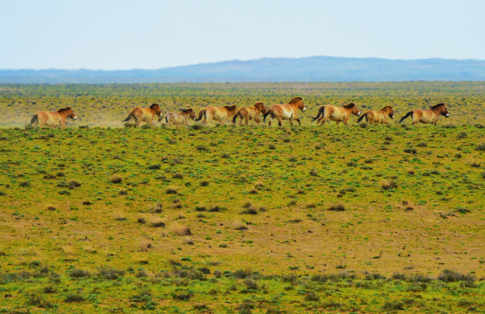 ↑一群普氏野马在新疆卡拉麦里山有蹄类野生动物自然保护区奔跑(2021年4月22日摄)。