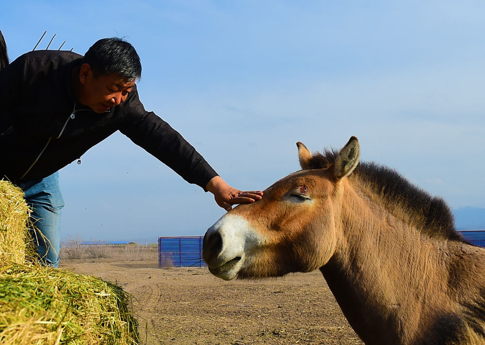 ↑新疆野马繁殖研究中心工程师张彦豹抚摸普氏野马(2021年4月21日摄)。