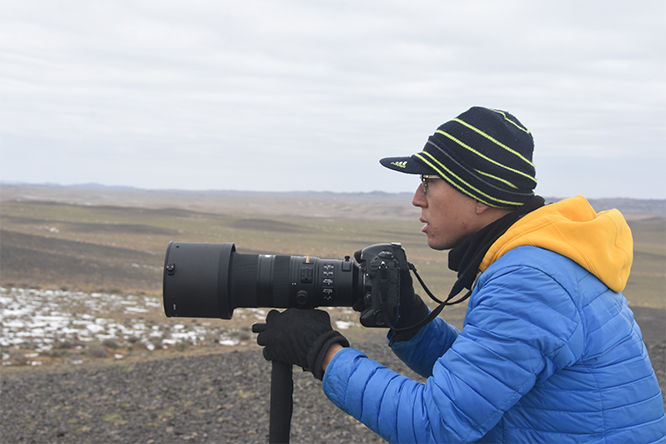 ↑2021年4月23日,侯昭康在新疆卡拉麦里山有蹄类野生动物自然保护区采访。