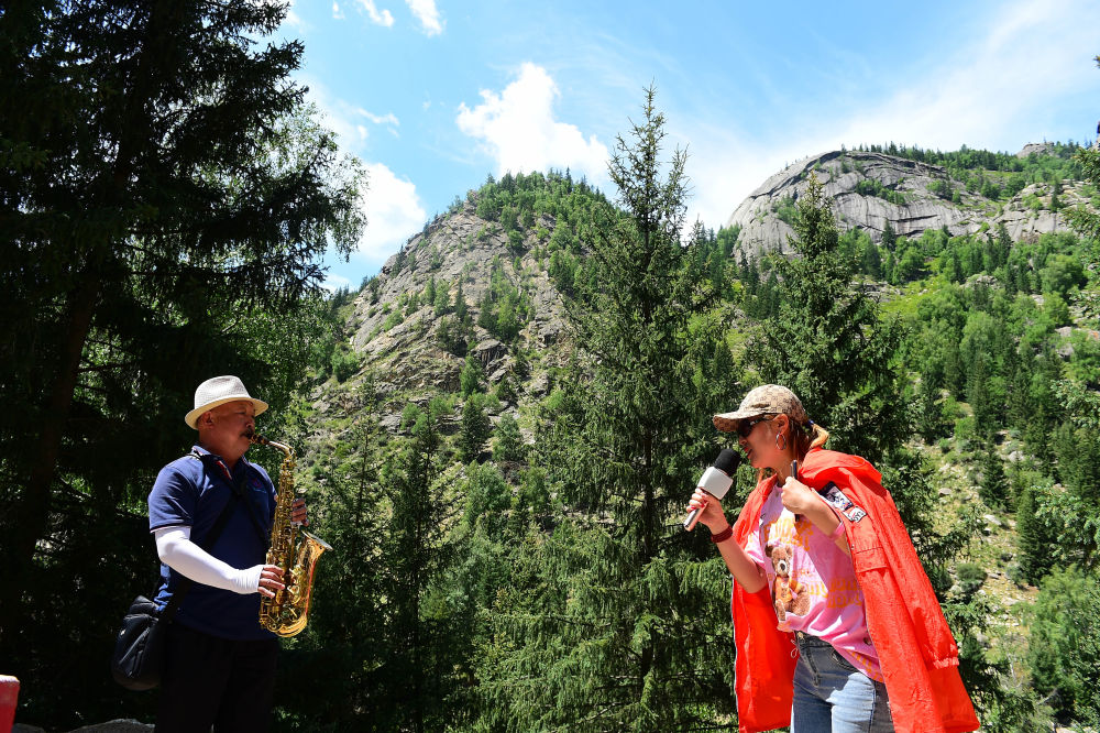↑2021年7月15日,游客在可可托海镇额尔齐斯大峡谷景区参与互动表演。