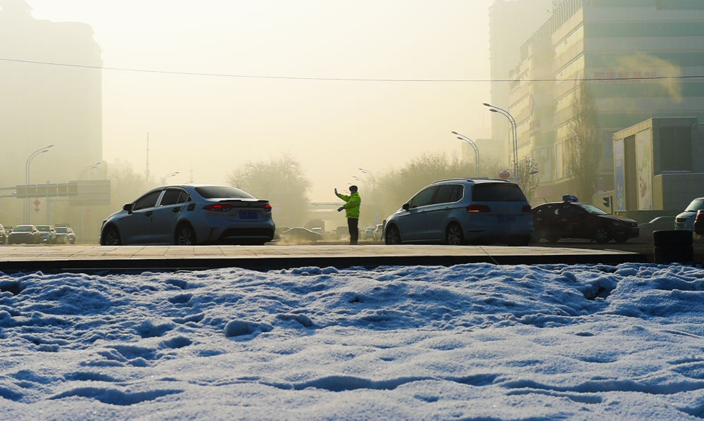 ↑2020年12月16日,在新疆乌鲁木齐,一名交警在路口指挥交通。近日,乌鲁木齐气温骤降,最低温度逼近零下20摄氏度。