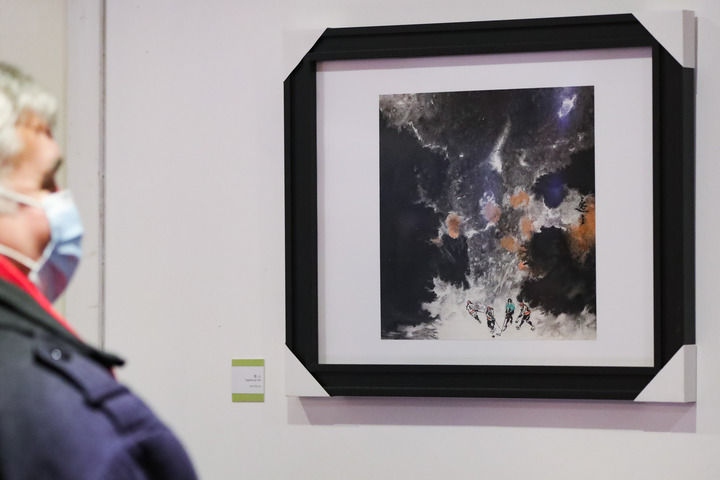 1月25日,嘉宾在比利时安特卫普举行的比利时侨胞“迎冬奥送祝福”活动上观看旅比画家姚逸之为北京冬奥会创作的美术作品。新华社记者郑焕松摄