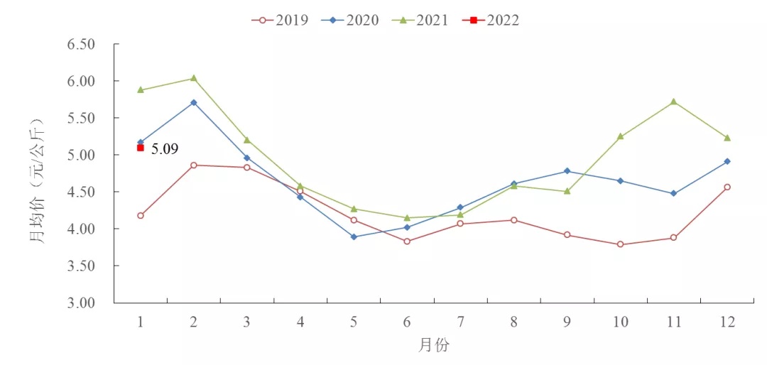 ▲ 2019—2022年蔬菜月度价格比较