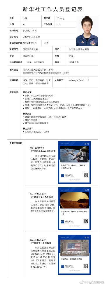 【#全球首位数字航天员入驻微博#】欢迎我的同事#新华社数字记者#@小诤_ZHENG ,全球首位数字航天员,上过空间站,去过火星!又美又飒,还不快去粉她!