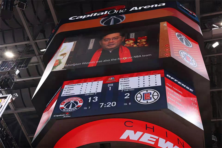 比赛吸引近万名美国篮球迷现场观赛。开赛后暂停时段,球场大屏幕播出秦刚致辞视频。秦刚向现场球迷问好,并祝贺NBA成立75周年,期待NBA未来的发展会更好。他表示,因曾有著名中国球员代表两队比赛,广大中国球迷对华盛顿奇才队和洛杉矶快船队都情有独钟。