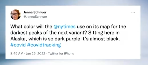 “一片红”甚至“红得发紫”的景象,也让不少美国民众感到心慌,一位来自阿拉斯加的美国网友质问,不知道紫色之后还会用什么颜色来代表下一个变异毒株带来的疫情高峰?