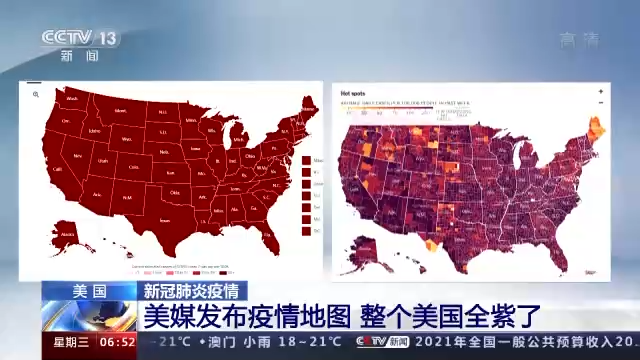 当地时间25日,多家美国主流媒体援引美国相关卫生机构数据,公布了最新疫情地图,根据疫情数据严重程度由浅至深的色彩标注,美国几乎全境都呈现出一片“红紫色”。