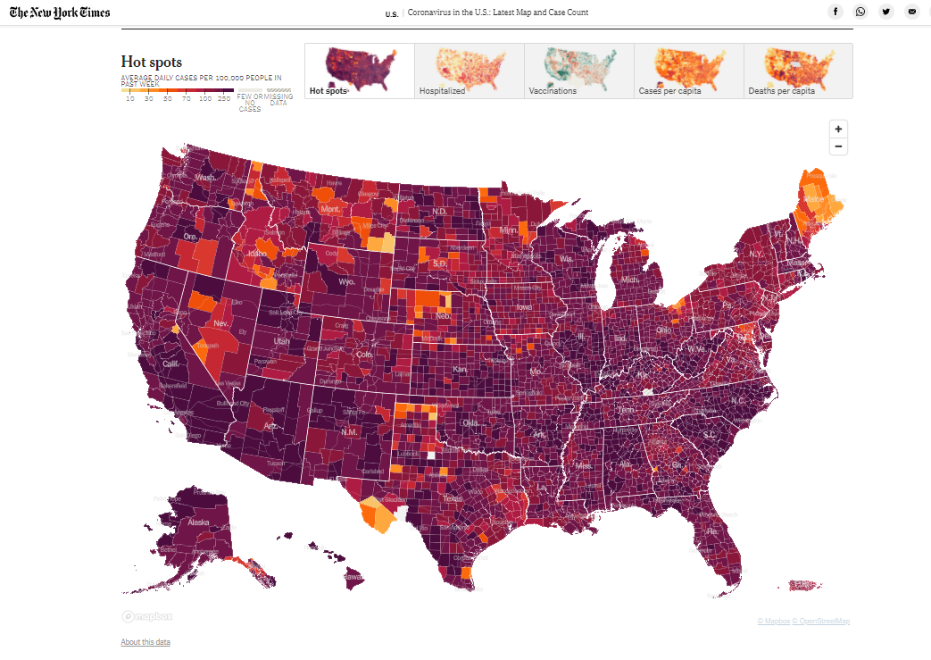 《纽约时报》当天发布的疫情地图则更为醒目,过去一周,每十万人的日均新增确诊病例数从低到高颜色依次由黄色渐变到橘色,再到红色,最后到超过250人为紫色甚至更深。而整张疫情地图的大部分地区已经到达最深的紫色,部分地区甚至紫的发黑。