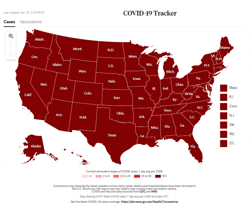 在美国广播公司公布的疫情地图上,截至24日的7天内,美国每十万人中的日均新增确诊病例数由低到高颜色标记由浅到深,超过50人的地区为最严重程度,标记为深红色,而从地图上可以看出,美国全境已沦陷为深红色。