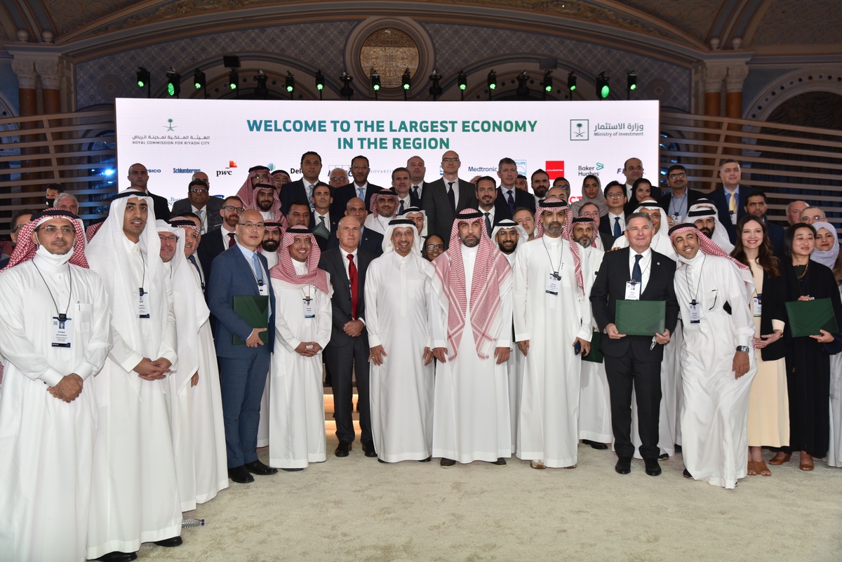 2021年10月27日,在沙特阿拉伯利雅得,部分跨国企业代表及与会嘉宾在第五届“未来投资倡议”大会期间合影。(新华社记者王海洲摄)