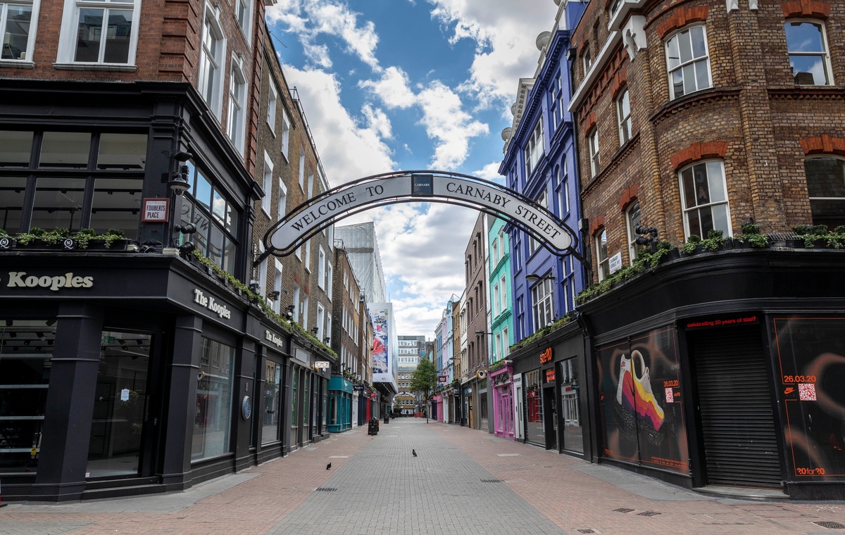 这是2020年5月12日在英国伦敦主要商业街之一卡纳比街拍摄的关闭的店铺。(新华社记者韩岩摄)