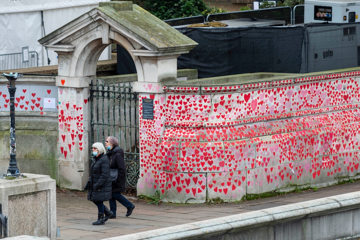 1月19日,人们经过英国伦敦的国家新冠纪念墙。为纪念在新冠疫情中去世的人们,英国伦敦议会大厦对面泰晤士河沿岸设立了国家新冠纪念墙。逝者的亲友和志愿者在几百米长的纪念墙上画上红色的心,每一颗心代表一名因新冠去世的英国人,表达对逝者的哀思。(新华社发,史蒂芬·程摄)