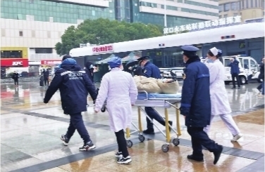 演练中,医护人员救治摔伤旅客。通讯员高四光 摄