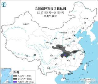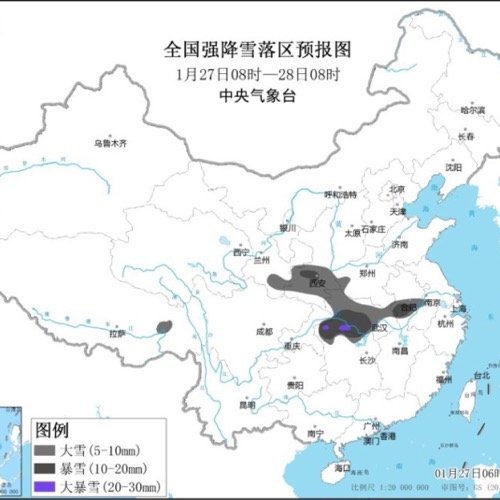 【#中央气象台升级暴雪预警为黄色#陕鄂皖湘将有大到暴雪】记者从中央气象台了解到,1月27日中央气象台将暴雪预警从蓝色升级至黄色。预计1月27日8时至28日8时,强降雪区域东扩南压,降雪核心区位于陕西中南部、湖北、安徽中部和湖南北部等地,降雪量普遍达到大雪或暴雪程度,湖北西南部局地将有大暴雪。专家表示,今明两天将是本轮雨雪天气过程的最强时段,建议公众做好相关防护。(图片来源:中央气象台)