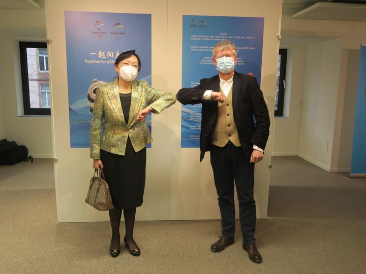 中国驻卢森堡大使杨小茸(左)与卢森堡奥委会秘书长达克斯(右)共同出席“一起向未来”北京冬奥会主题图片展开幕式。(图片由中国驻卢森堡大使馆提供)