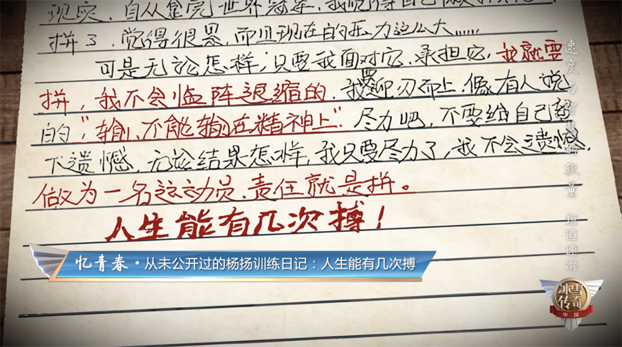 节目现场,主持人王冰冰还分享了来自杨扬的日记。日记中,记载了杨扬当年参赛时的心情,其中有一句话,给所有人留下了深刻的印象——“人生能有几回搏”。杨扬说:“当多年以后自己再次看见这本日记时,也会感动。为当时努力拼搏的自己、为作为一名运动员勇于直面挑战的责任、为作为中国人坚强不服输的精神。”