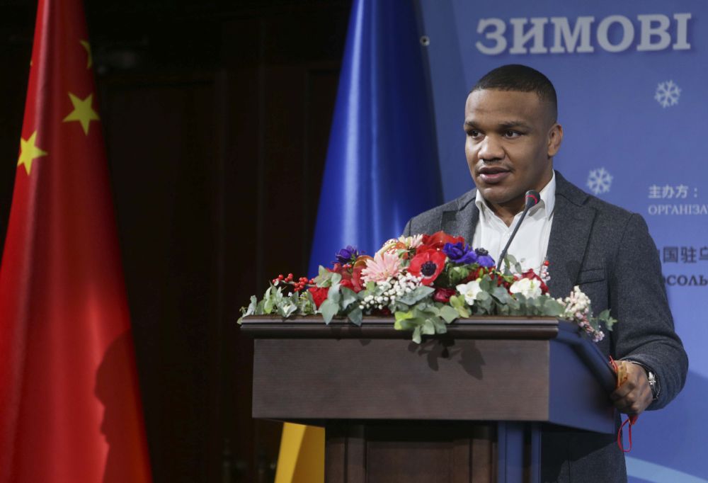 1月26日,乌克兰摔跤奥运冠军别列纽克致辞。新华社发(谢尔盖·斯塔拉斯坚科摄)