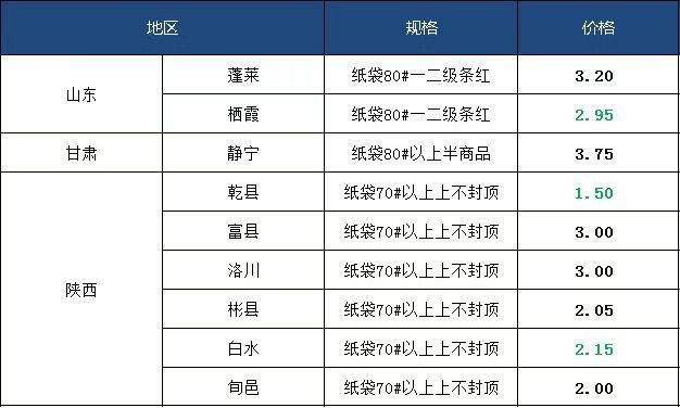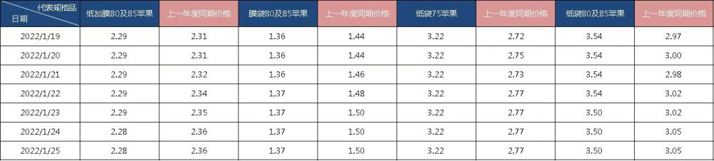 指数监测显示,截至1月25日,纸加膜80及85规格富士苹果均价为2.28元/斤,膜袋80及85规格富士苹果均价为1.37元/斤,纸袋75规格富士苹果均价为3.22元/斤,纸袋80及85规格富士苹果均价为3.50元/斤。