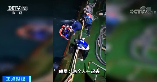 视频当中,有几名男子套着救生圈漂浮在水中,还有多名船员正合力将让他们拉上船。
