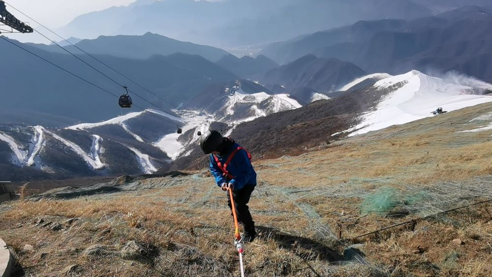 2022年1月5日,歌华有线高山滑雪运维保障团队成员张永毅在北京冬奥会延庆赛区国家高山滑雪中心的山顶出发区沿岩壁布放光缆。受访者供图