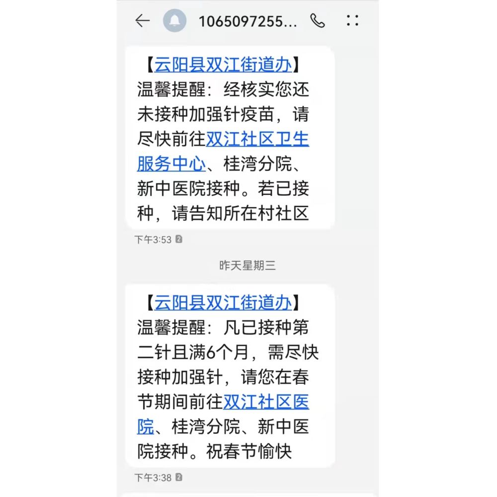 图为广州市民陈先生从未去过重庆云阳县,却多次收到云阳县双江街道办发来的短信。