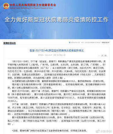 截至1月27日24时,据31个省(自治区、直辖市)和新疆生产建设兵团报告,现有确诊病例2268例(其中重症病例9例),累计治愈出院病例98971例,累计死亡病例4636例,累计报告确诊病例105875例,现有疑似病例3例。累计追踪到密切接触者1510597人,尚在医学观察的密切接触者40464人。