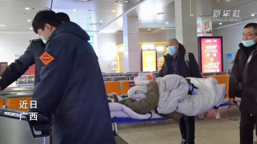 【#受伤女乘客春运担架出行#获铁路暖心服务】近日,在广西桂林北火车站,一名女乘客因受伤只能靠担架出行乘火车回家,桂林北火车站客运值班员王海涛了解情况后,为其制定了专门的服务方案,从进站到乘车,全程进行护送。王海涛还与列车乘务员进行沟通,为受伤女乘客做好重点旅客服务交接,将爱心传递到列车上。列车员特意安排餐车为女乘客制作了营养餐,全程进行照顾,并联系到达车站做好出站服务。戳视频,为铁路工作者的暖心点赞↓ 新华社的微博视频