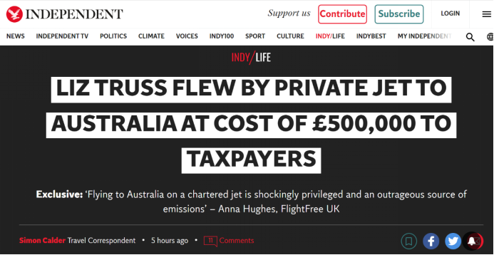 《独立报》:利兹·特拉斯乘坐私人飞机前往澳大利亚,纳税人为此花费50万英镑