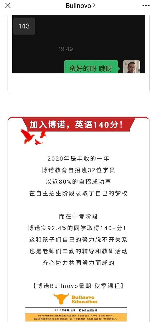 当事人在自营公众号“博诺教育”上发布《晒中考成绩单!博诺缔造传奇》的广告,内容包含“加入博诺,英语140分”的广告宣传,属于对中考英语成绩作出了明示的保证性承诺,违反了《中华人民共和国广告法》第二十四条第一款“教育、培训广告不得含有下列内容:(三)对升学、通过考试、获得学位学历或者合格证书,或者对教育、培训的效果作出明示或者暗示的保证性承诺”的规定。市场监管部门依法责令当事人停止发布违法广告,责令消除影响,处罚款4万元。