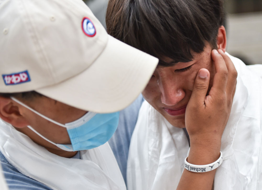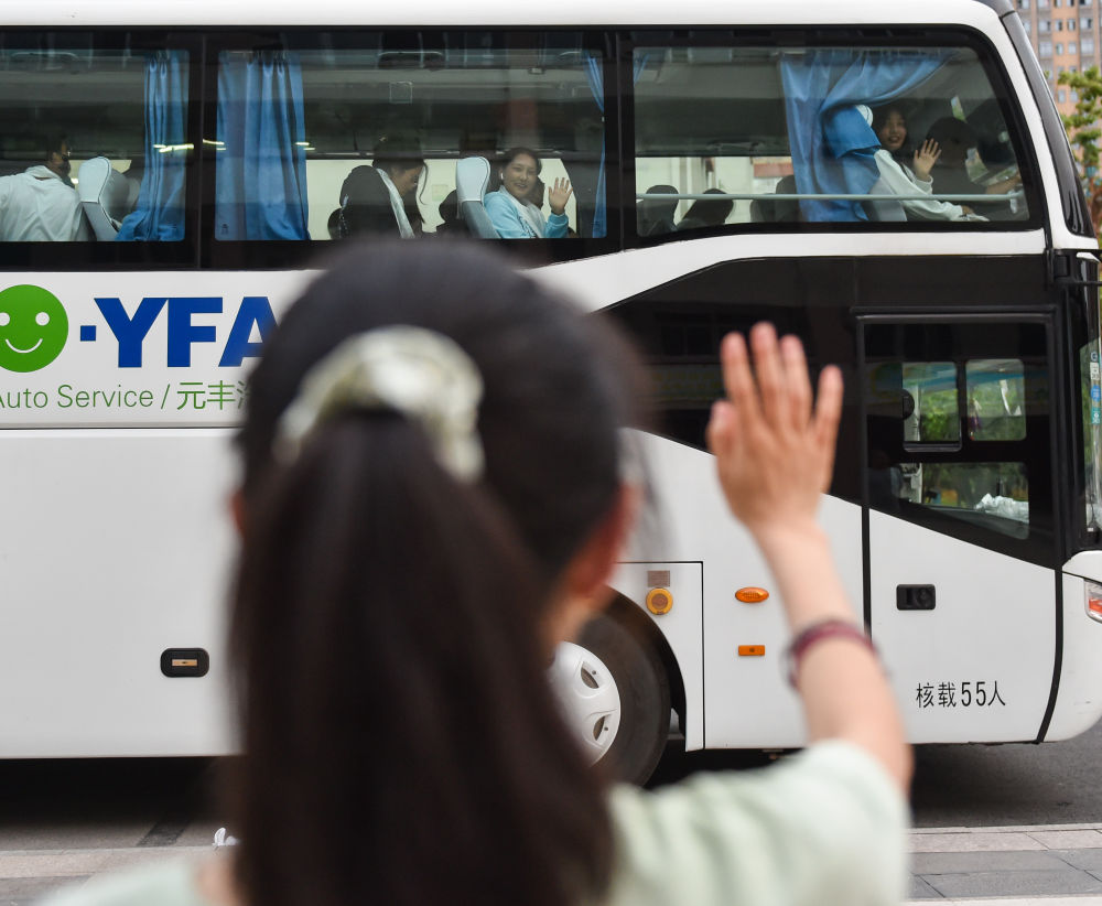 ↑2021年6月9日,在安徽省合肥市第三十五中学,西藏班的高三毕业生和同学道别。