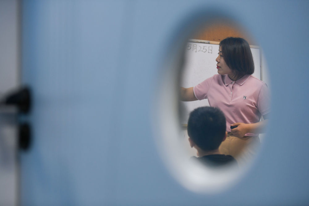 ↑2021年5月25日,周敏在芜湖市翰宁教育尊纳儿童发展中心给孩子们上课。