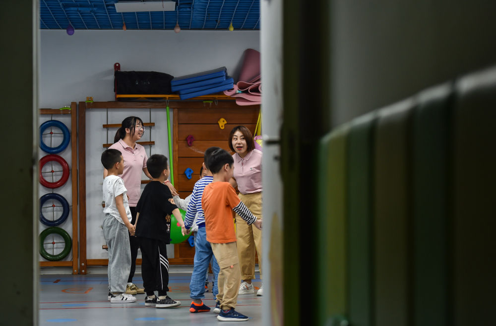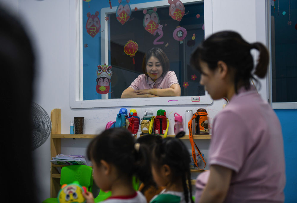↑2021年5月25日,周敏(中)在芜湖市翰宁教育尊纳儿童发展中心观察孩子们的活动。