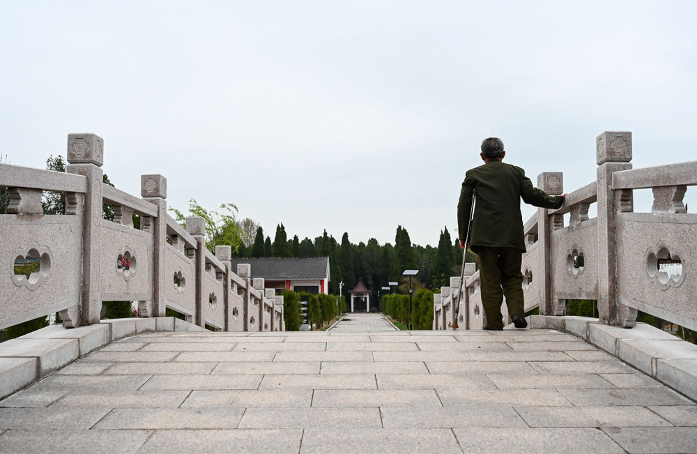 4月的皖北平原,春风还参杂着凉意。我带着多种设备独自踏入宿州市泗县大杨乡东赵集烈士陵园里,身形有些佝偻的老人拄着拐微微踉跄地走着,眼神坚毅。