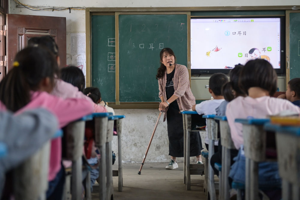 透过窗,一阵阵琅琅书声传向天际,元芳老师一手拄拐一手捏紧粉笔板书,讲桌旁的板凳不只是用来坐,在感到劳累时,她放下拐杖,单腿跪在板凳上讲课。因长时间拄拐站立教学导致脊柱逐渐侧弯变形,腰和腿时常疼痛难忍,所以跪在板凳上授课是一种缓解疼痛的方式。9月的天气,热浪依旧奋力喘息,一场课下来,汗水浸润衣衫,握拐的手却依旧那样有力。教师是辛勤的园丁,把甘露轻轻洒向茁壮的新苗,老师对学生的厚爱尽在不言中。