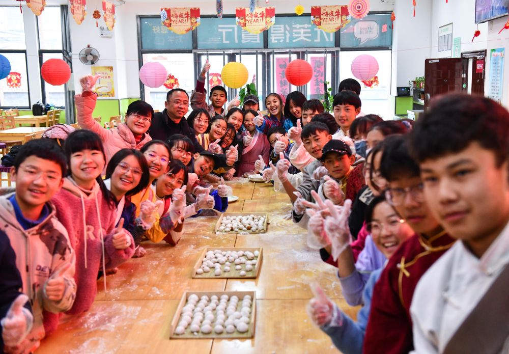 ↑2021年2月26日,师生在合肥市第三十五中学展示做好的汤圆。