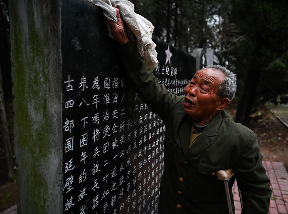 ↑2021年4月1日,赵贤军在泗县大杨乡东赵集烈士陵园里擦拭墓碑。