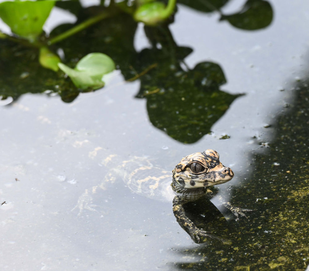 ↑2021年7月6日,扬子鳄幼鳄在安徽扬子鳄国家级自然保护区孵育中心幼鳄饲养区的池塘内活动。