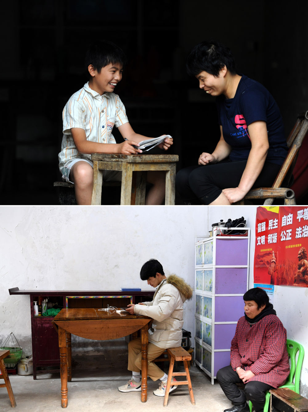 这是一张拼版照片,上图为:程保留在母亲身边做暑假作业(2014年7月15日摄);下图为:程保留在家里复习功课(2021年1月24日摄)。新华社记者 刘军喜 摄