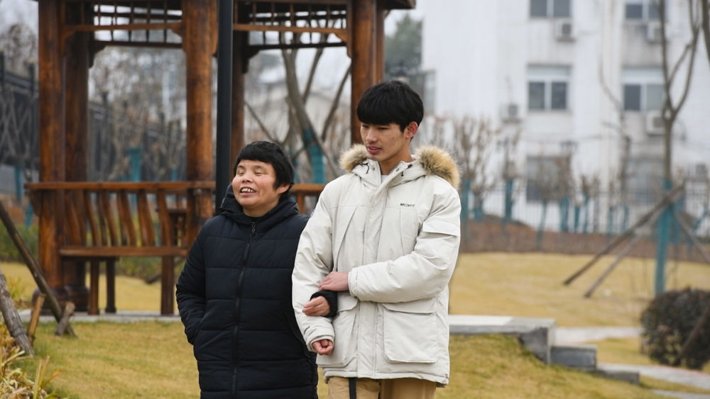 ↑2021年1月24日,程保留拉着母亲的手在公园里散步。
