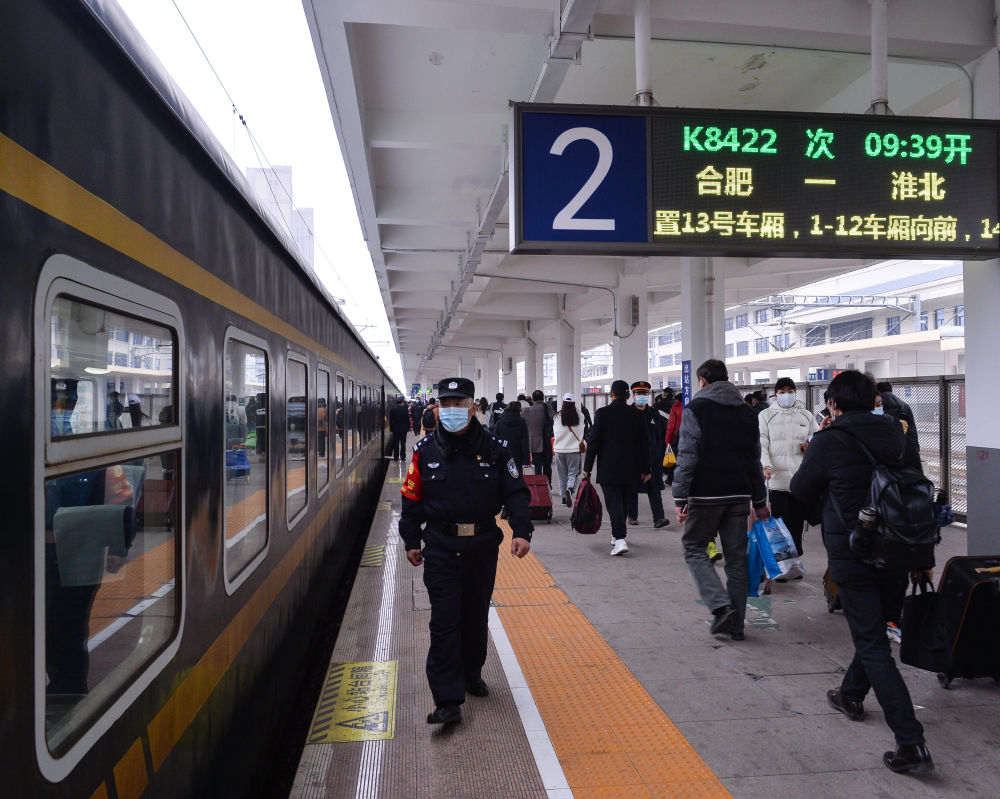 ↑2021年2月5日,K8422次列车途经站淮南站,周彪进行发车前安全巡逻检查。