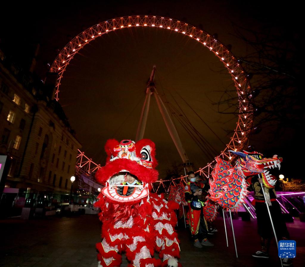1月28日,在英国伦敦,演员在亮起“中国红”的“伦敦眼”前表演舞狮。