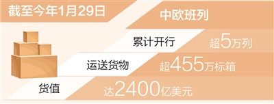 中国国家铁路集团有限公司最新数据显示:截至今年1月29日,中欧班列累计开行超5万列、运送货物超455万标箱、货值达2400亿美元。
