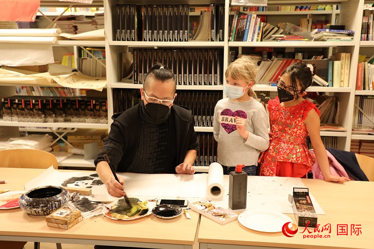 旅比艺术家张文海为孩子们展示中国画艺术。人民网记者 张朋辉摄