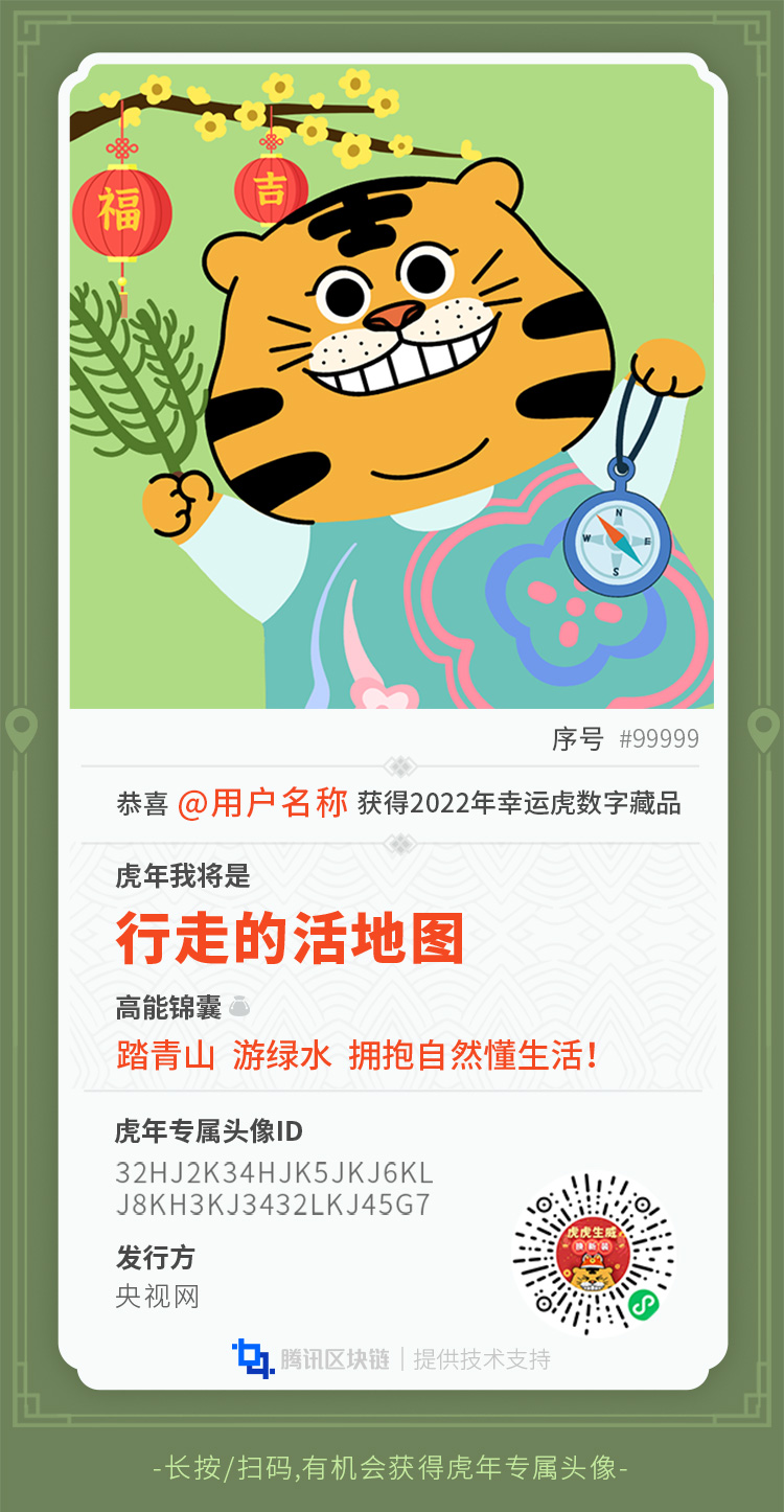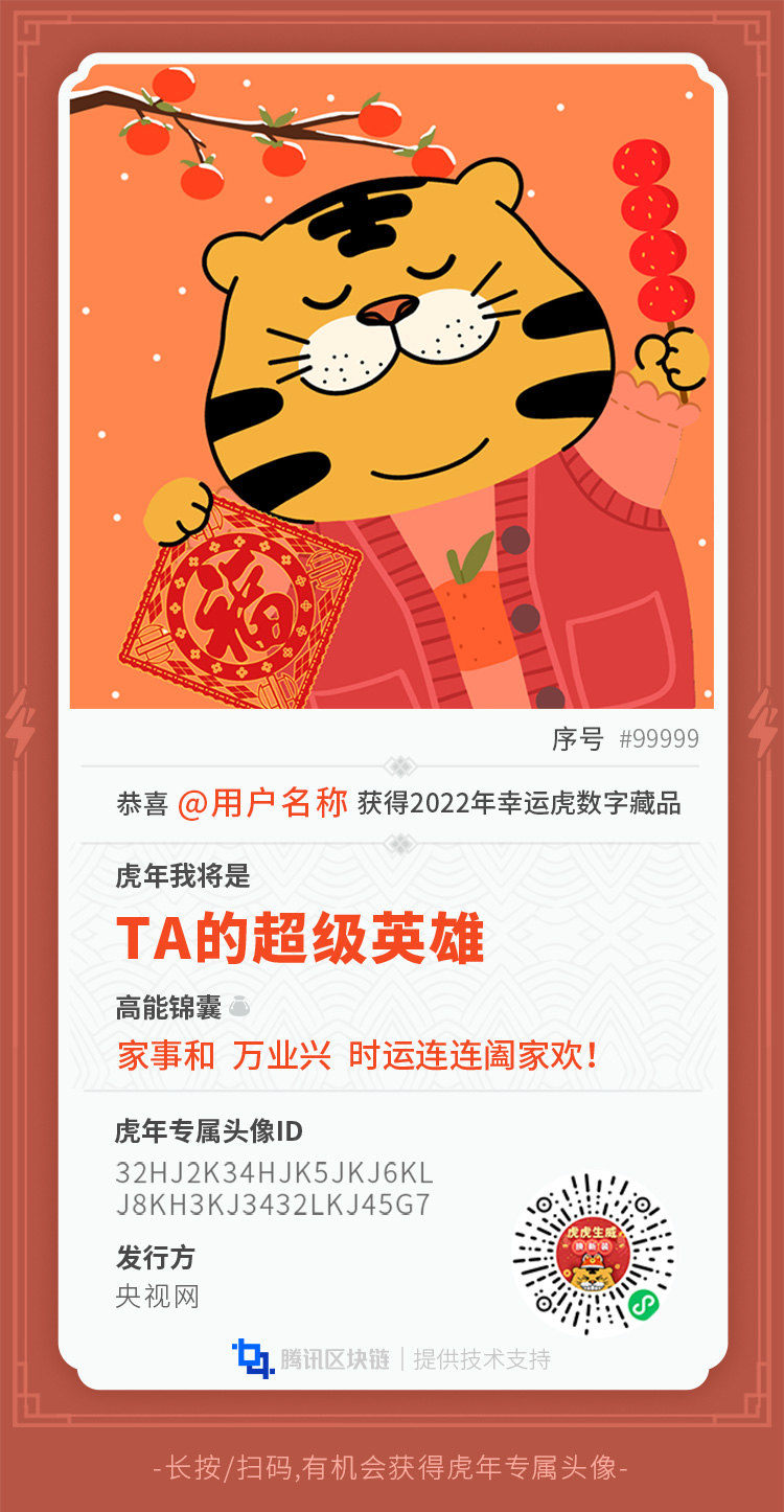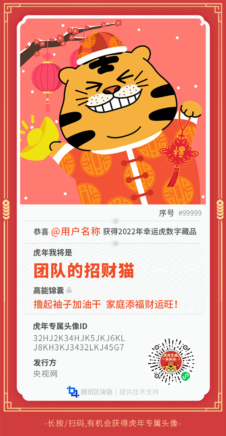 随着虎年脚步的临近,为了增加新春的喜庆氛围,让大家在佳节来临之际在轻松快乐的氛围下图个好兆头,也种下自己的虎年小目标,央视网和腾讯区块链联合推出的2022春节限定 “虎虎生威换新装”数字藏品将给您带来满满虎福。