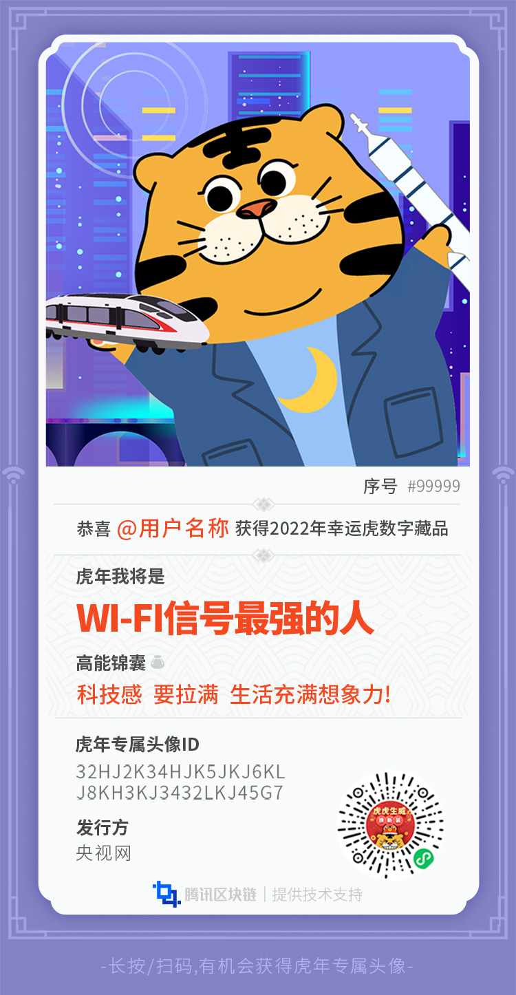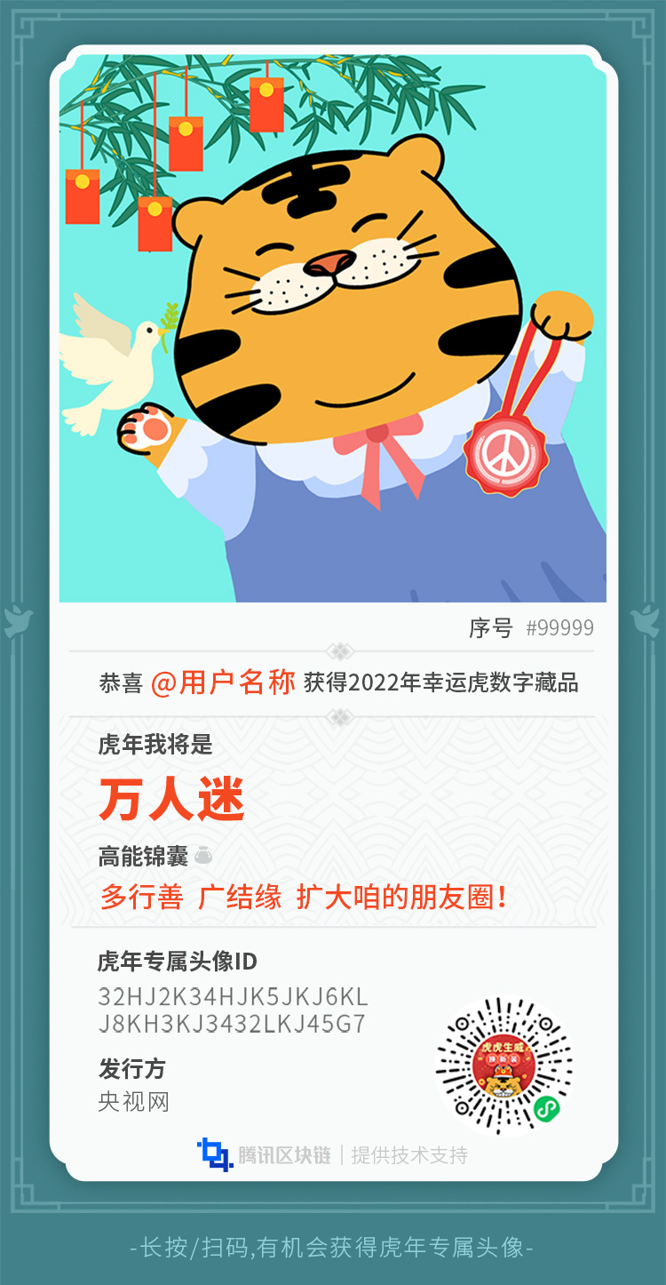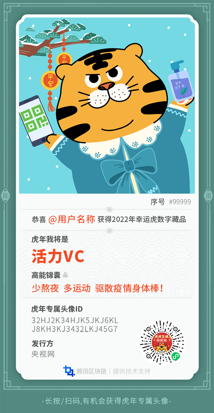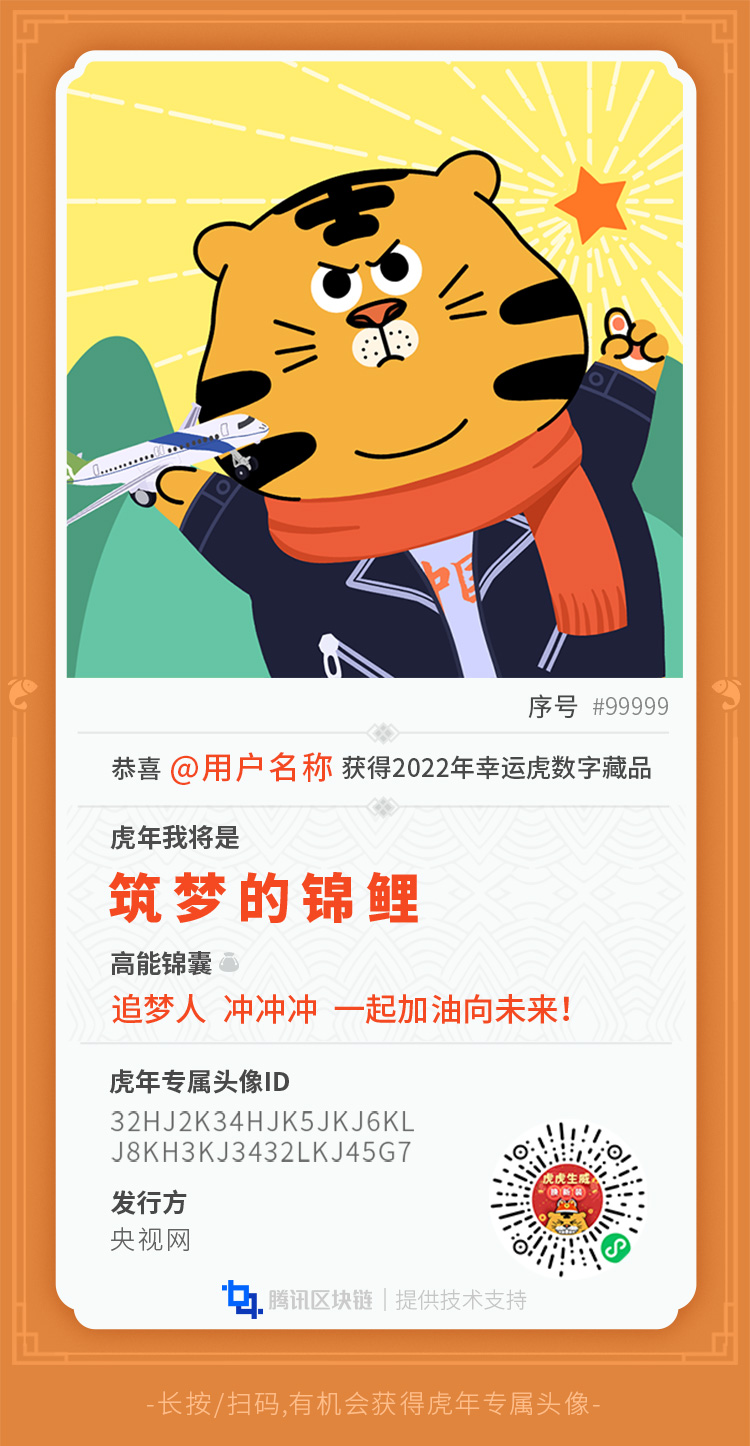 随着虎年脚步的临近,为了增加新春的喜庆氛围,让大家在佳节来临之际在轻松快乐的氛围下图个好兆头,也种下自己的虎年小目标,央视网和腾讯区块链联合推出的2022春节限定 “虎虎生威换新装”数字藏品将给您带来满满虎福。