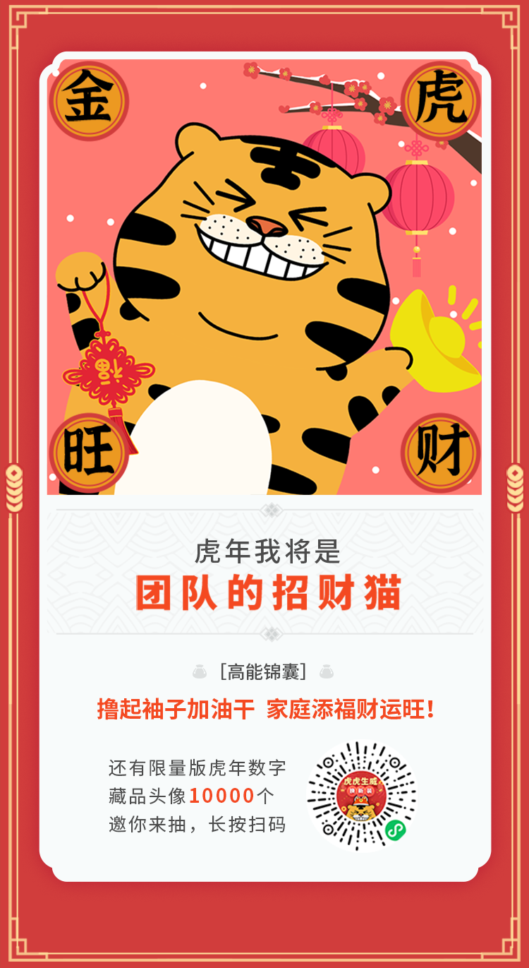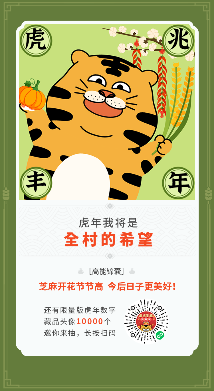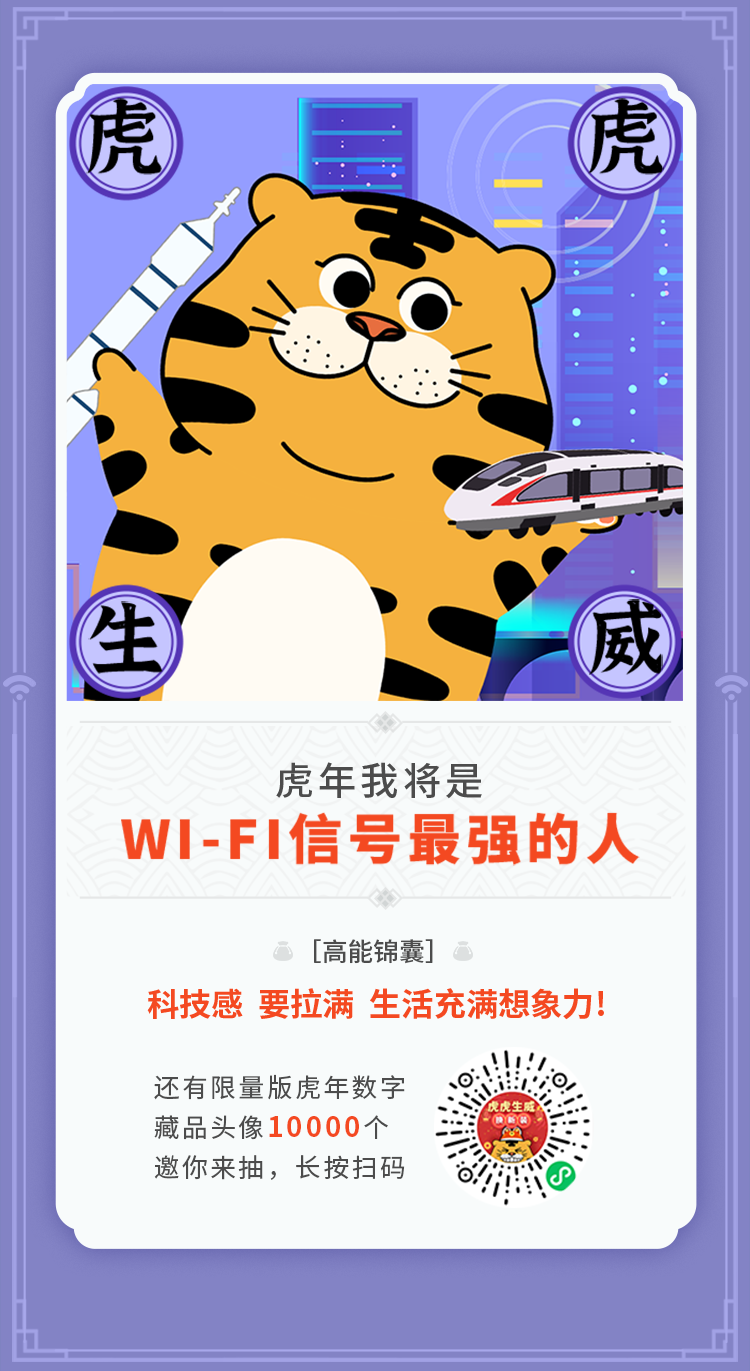 虎年首发的“数字福卡”互动小程序将为您带来科技感十足的浓郁迎春氛围。 此次“虎虎生威换新装”数字藏品,限量发行10000款,快来抽取吧!